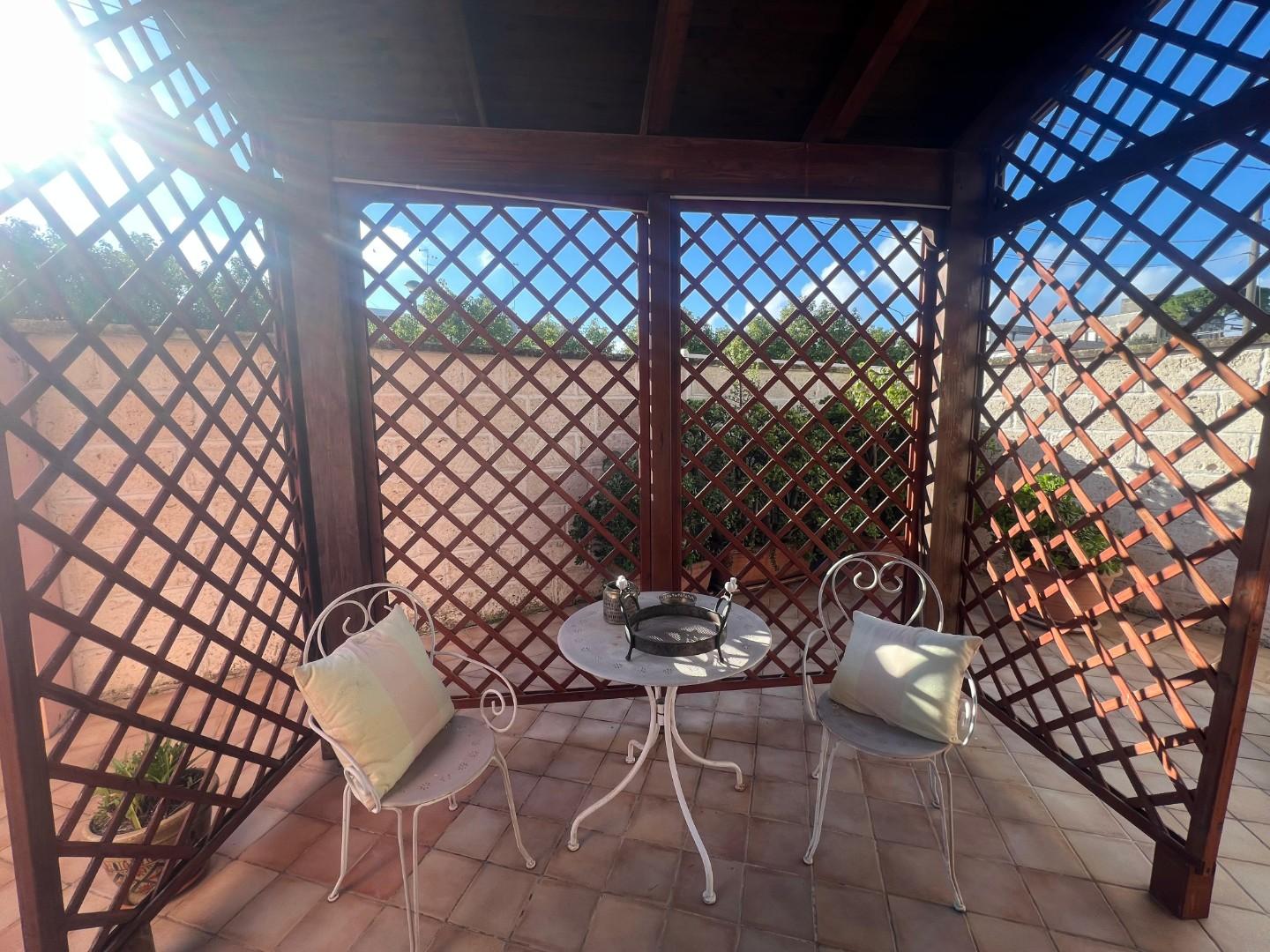 Il giardino, rigoglioso e curato, cinge la casa con la sua eleganza discreta. Zone verdi si alternano a superfici pavimentate dove sorgono pergolati attrezzati: spazi ideali per pranzi all’aperto, letture pomeridiane, serate estive tra amici.